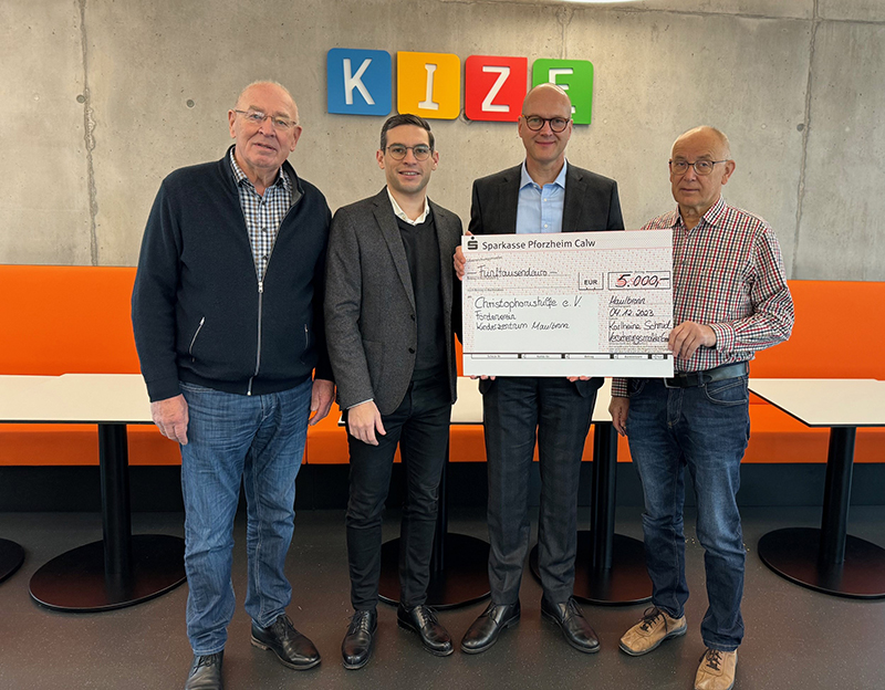 Die Karlheinz Schmid Versicherungsmakler GmbH aus Mühlacker hat der Christophorushilfe e.V. Förderverein für das Kinderzentrum Maulbronn eine Spende über 5.000,00 Euro übergeben. Dafür bedanken sich die Vorstände der Christophorushilfe e.V. Werner Hupbauer und Karl Craiß mit dem Geschäftsführer des Kinderzentrums Maulbronn Dirk Berner bei Herrn Björn Schmid, Geschäftsführer des Versicherungsmaklers, sehr herzlich.
